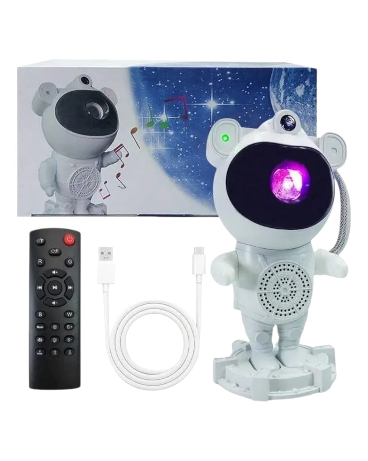 أضف لمسة من السحر إلى غرفتك مع جهاز عرض النجوم المبتكر بتصميم رائد الفضاء الأنيق. يعكس أضواء ملونة على الجدران والسقف ليحول المكان إلى مشهد ليلي ساحر مليء بالنجوم. يتميز بإضاءة ناعمة ومؤثرات ضوئية جميلة تساعد على الاسترخاء والنوم الهادئ للأطفال والكبار. كما يحتوي على ميزة تشغيل الموسيقى لتجربة مريحة وممتعة قبل النوم.