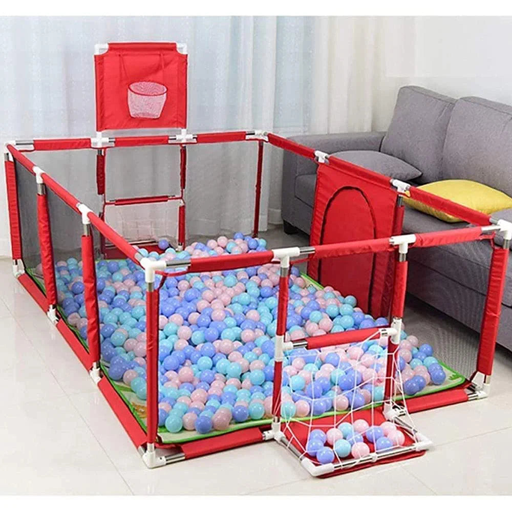سياج لعب آمن وعملي للأطفال بتصميم مستطيل واسع يتيح للطفل اللعب بحرية داخل مساحة آمنة. مصنوع من قماش متين مع جوانب شبكية شفافة تسمح بتهوية جيدة وتمنح الأهل إمكانية متابعة الأطفال بسهولة.