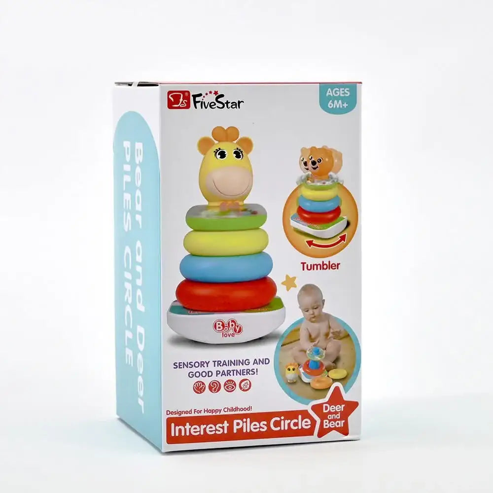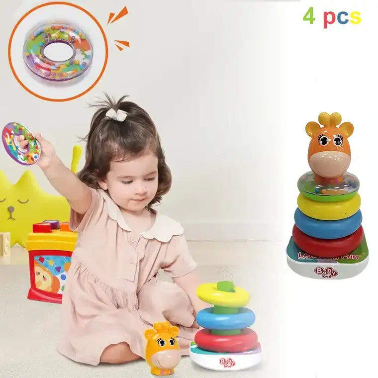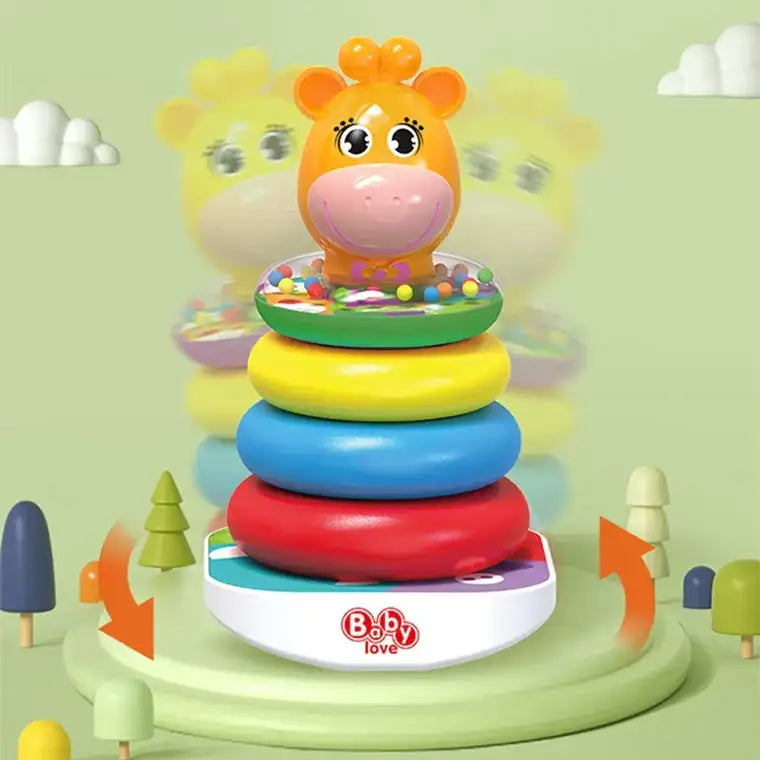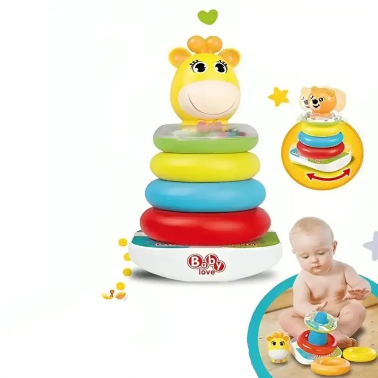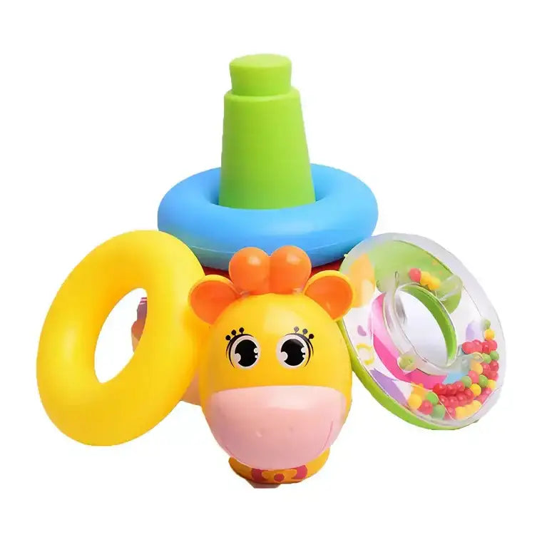 لعبة تفاعلية تعليمية للأطفال من عمر 6 أشهر وأكثر، مكوّنة من قاعدة متوازنة على شكل Tumbler (تتمايل ولا تسقط) مع حلقات ملوّنة قابلة للتركيب، ورأس على شكل شخصية لطيفة (زرافة). صُممت خصيصاً لتنمية مهارات الطفل الحسية والحركية من خلال اللعب الممتع.
