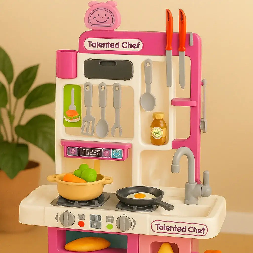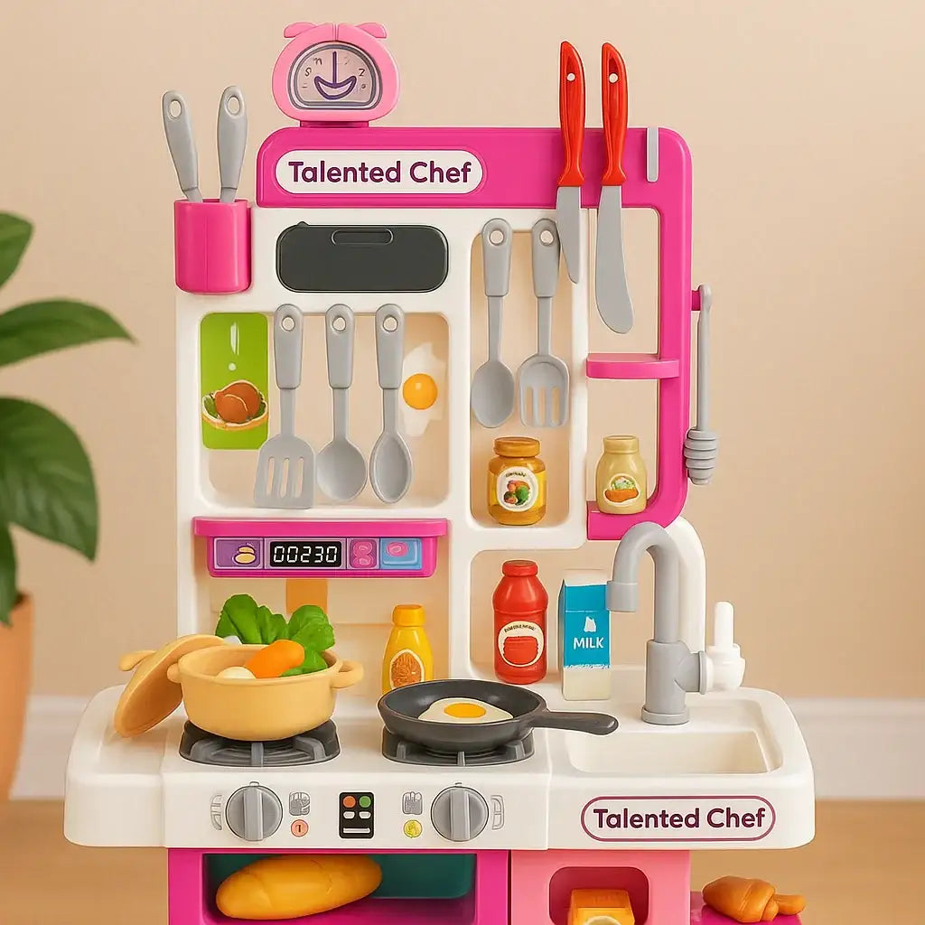 مجموعة مطبخ ألعاب واقعية ومليئة بالتفاصيل لتشجيع الأطفال على اللعب التخيلي وتطوير مهاراتهم الاجتماعية. المطبخ مزوّد بأدوات وأجهزة تحاكي الواقع مثل الفرن، الغاز، الحوض، والثلاجة، مع أكثر من 100 قطعة إكسسوارات تحاكي المنتجات الحقيقية.