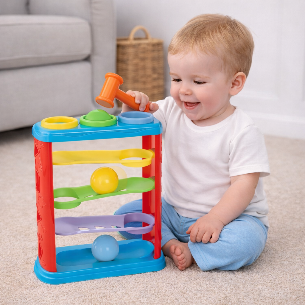 تتضمن المسار ذو 4 مستويات مع مطرقة و 3 كرات ملونة مصممة خصيصًا لتناسب أيدي الأطفال الصغيرة. يمكن للأطفال ضرب الكرات بالمطرقة ومشاهدتها وهي تتدحرج على المسار لتوفر لهم ساعات من المرح ت