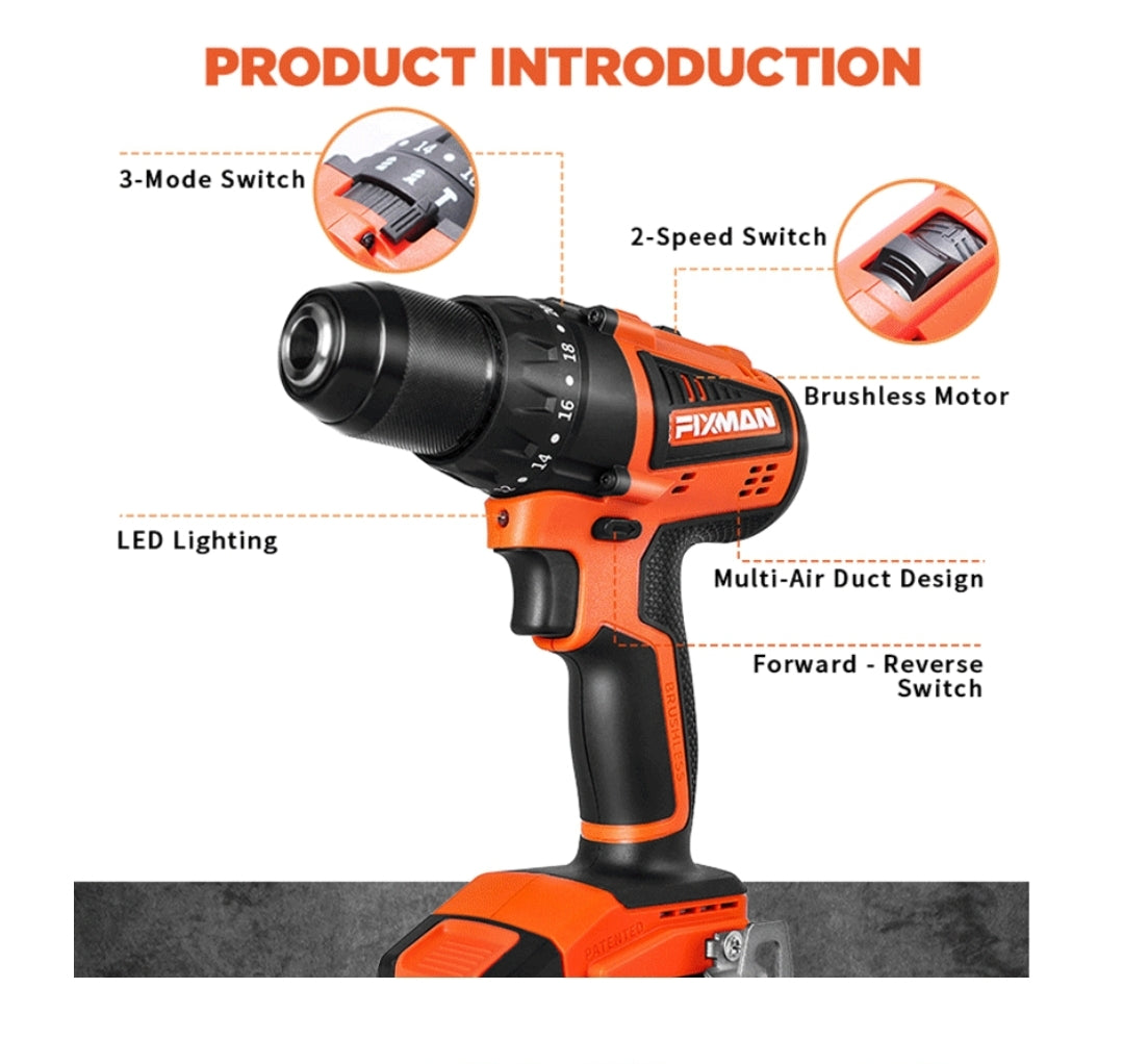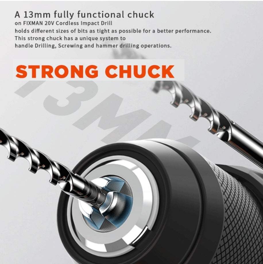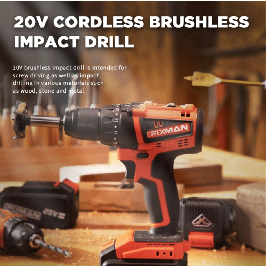 المثقاب اللاسلكي بتقنية المحرك عديم الفُرش (Brushless Motor) من FIXMAN بقدرة 20 فولت مصمم لربط وفك البراغي وكذلك للحفر بالطرق في مختلف المواد مثل الخشب، الحجر، الخرسانة والمعدن. يتميز المحرك العديم الفُرش بعدم وجود فُرش كربونية داخله، ما يمنحه قوة أكبر، عمر أطول، استهلاك أقل للبطارية وحرارة أقل مقارنة بالمحركات التقليدية. مع ظرف معدني بقياس 13 ملم، يعتبر هذا المثقاب من الأدوات العملية متعددة الاستخدام.